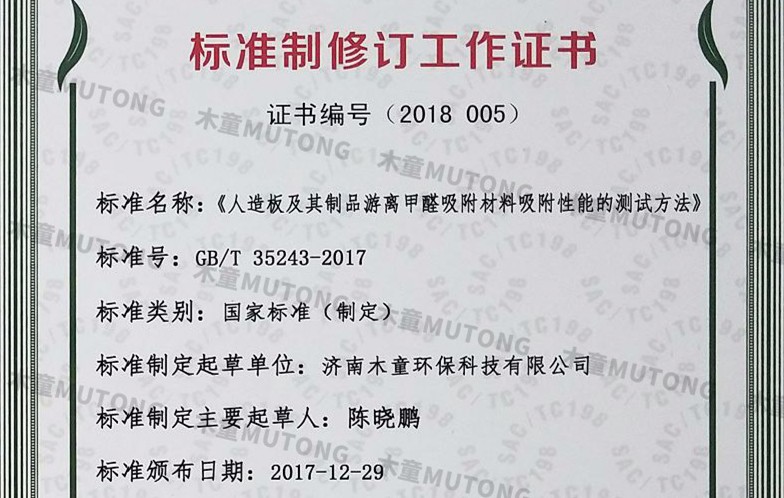 2018年人造板及其制品游離甲醛吸附材料吸附性能的測試方法國標(biāo)制定參與證書