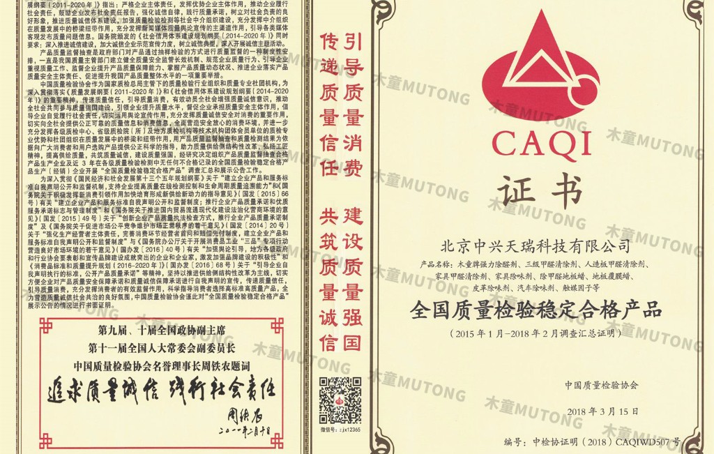 2018年木童除甲醛除異味系列室內(nèi)空氣污染治理產(chǎn)品憑借其核心技術(shù)優(yōu)勢和過硬的產(chǎn)品質(zhì)量以及空氣治理明顯效果,再次榮獲“全國質(zhì)量信得過產(chǎn)品”榮譽稱號。